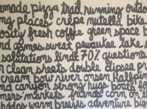 When I met my husband, one thing was very different from any other relationship I’d had in the past: We saw the world through the same lens. Even if our paths toward an end point differ, we’re generally looking out in the same direction…which is a huge comfort, particularly now, in the thick of the stressful and sleep-deprived years of early parenthood. One way we remind ourselves of what things bring joy and love is a painting we made a few years ago. It’s simply a list of things we both love…things that bind us…hung on the wall so we have a daily visual reminder of the joys that exist within and beyond the everyday.
