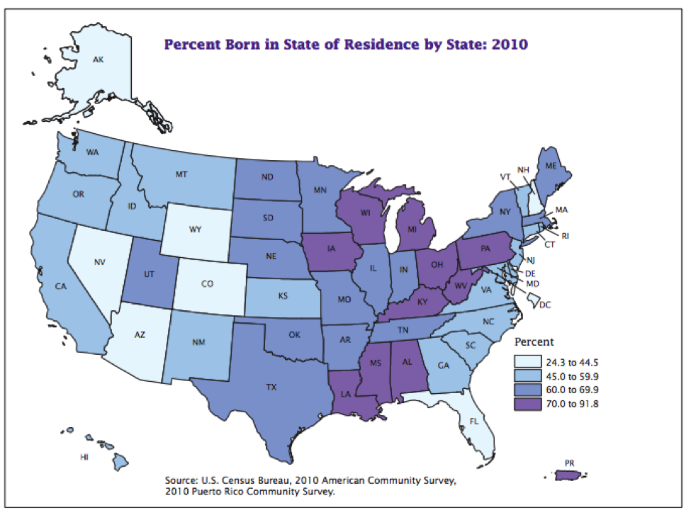 This experience really helped me understand how important community is in feeling grounded and rooted and well.  We know that longevity and well-being data (http://www.bluezones.com) points to community being critical to being healthy.  But according to an article in Psychology Today, the number of close confidants (people with whom they would feel comfortable sharing a problem) Americans reported having in 1996 was three, and by 2004, it dropped to one, with 25% of Americans saying that they have no one to confide in.  This may be, in part, due to our high mobility and increasingly busy lives.  Census Data tells us that just 59% of people today reside in the state in which they were born (see state-by-state breakdown below).