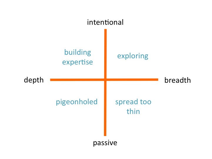 depth breadth frameworkIn short, we all want to be in one of the top two quadrants, and both are great places to be at different points in our lives. In fact, a period of exploration naturally leads to a period of focus; and that same period of expertise building can later give way to expansion.